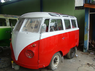 That night the brakes of the bus got even worst, and at times they were braking very hard and uneffective, and than while pressing softly nice and correct. In Effect, Filip had to drive slowly keeping the distance, and it was best to arrive in Semerang, thtough the high mountains while it was relatively empty on the roads. Yumos was very welcoming, Elios could play with his children, while Filip took time to make a small interview about the brasilian - to split transformations. The basic idea is to use popular in Indoensia - Brasilian vw bus made from 1980 to 1984 and converting it by cutting the front off and building from start a new vw split front. The work takes time and an average conversion from fisrt cut to paint takes an average of 6 months. The back corners get rounded off to oval lamps. The air vents get cut out, fliped and an extra cm is added where its needed. Front goes off, and new body is brought out. All the sheet work is done by hand. Formed painstakingly by Yumos skilled workers. The front doors, as well as side doors are also made to look like the old split. Even the Bumpers are folded and welded together to make a reproduction bumper. Afterwards the whole bus is covered with epoxi fiberglass filler to even out the uneven welds.